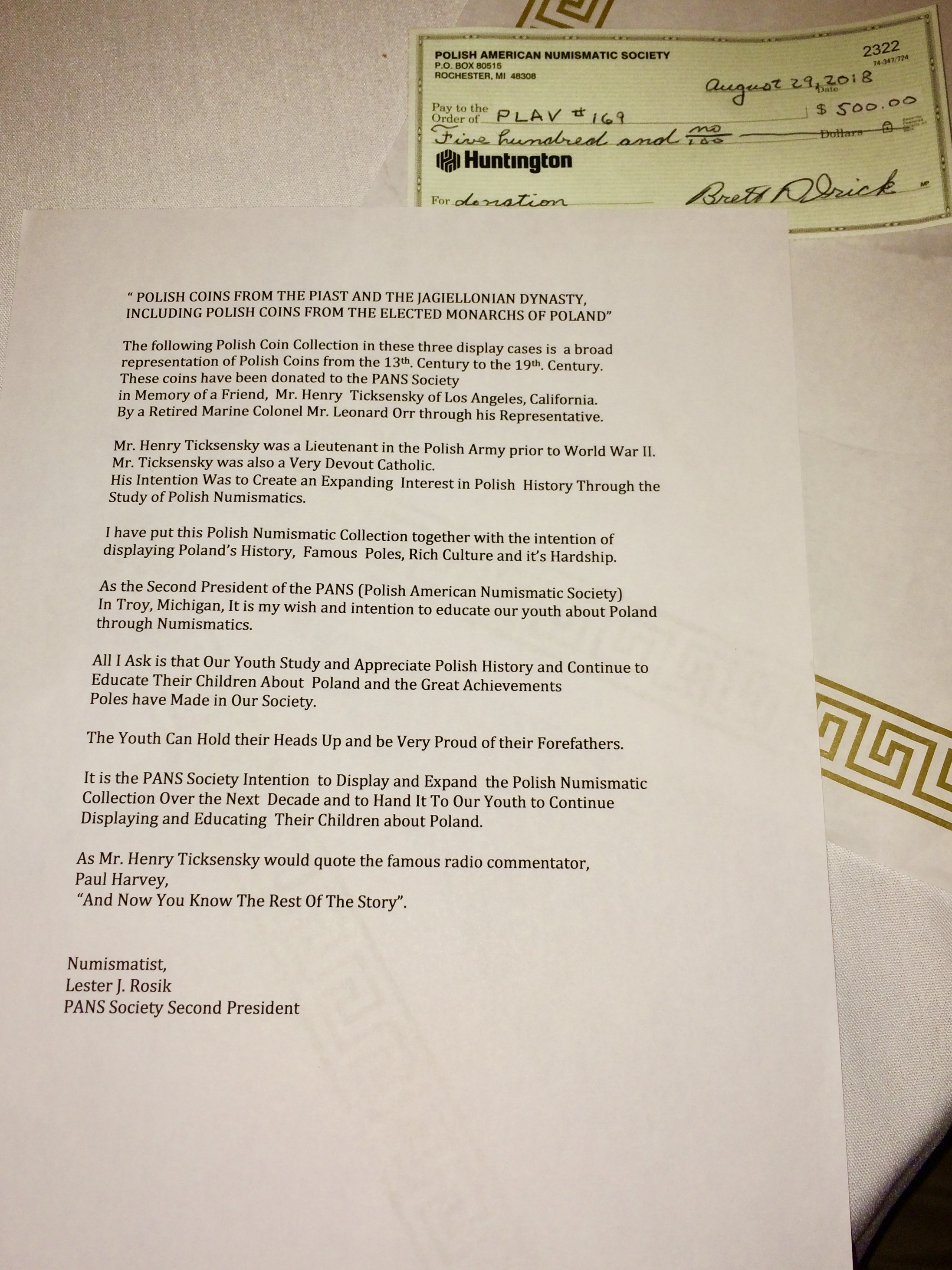 On Wednesday, August 29th, 2018, PANS had a Special Dinner Celebration of the Unveiling of Henry Ticksensky Polish Numismatic Exhibit of the “Polish Coins From the Two Dynasties of Poland and the Elected Kings of Poland”.